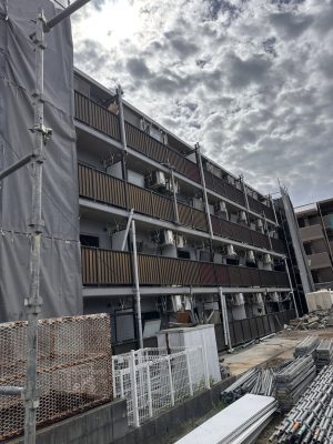 解体工事の初期段階では、まず足場の組立と養生シートの設置を行います。